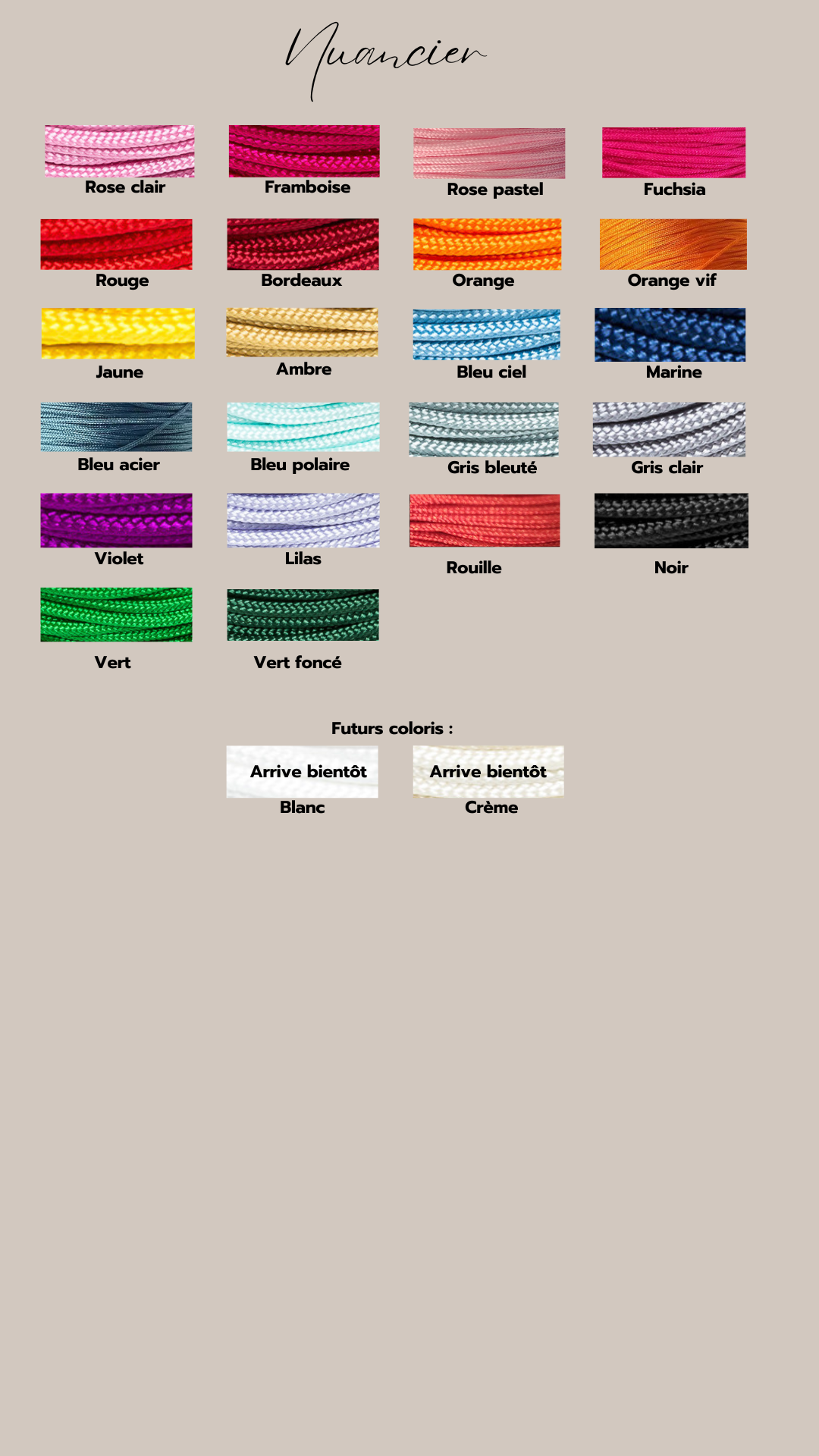 Grâce au nuancier composé de 22 teintes, offrez-vous le bracelet en micro-macramé qui vous fait envie. Pour choisir votre couleur, reportez-vous au nuancier présenté ci-contre.